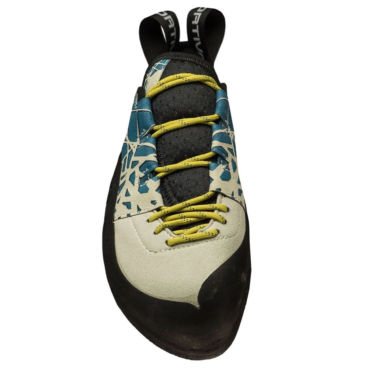 Der Kataki von La Sportiva ist ein vielseitiger Kletterschuh, konzipiert für Outdoor-Einsatz im Klettgarten, ideal bei Überhängen, unterstützt er Hooks durch die S-Heel™ Konstruktion. Das differenzierte Schnürsystem verleiht Struktur und differenziert sich vorne und hinten für eine perfekte Volumenregulierung. Kataki verwendet die P3 Technologie und garantiert die Beibehaltung der Form auch nach langer Zeit; die ¾ Besohlung mit Vibram XS Edge Mischung erleichtert zudem eine Neubesohlung. Ein harter Schuh, der doch eine gute Portion Sensibilität und Komfort bietet.