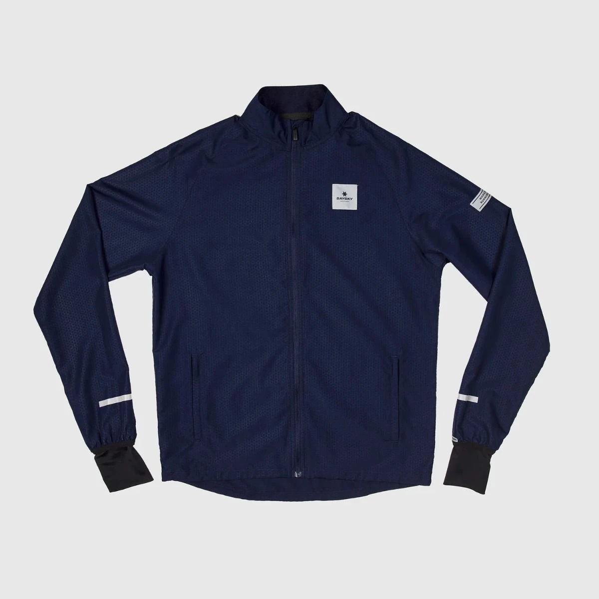 Die SAYSKY Clean Pace Jacket ist eine Unisex-Laufjacke, die dem Wind trotzen soll. Die Jacke ist blau, hat reflektierende SAYSKY Labels auf der Vorder- und Rückseite, und ein WORLDWIDE RUNNING TRIBE Label auf dem Arm. Der leichte Stoff sorgt für eine bequeme Passform und gewährleistet eine hohe Atmungsaktivität des Körpers.