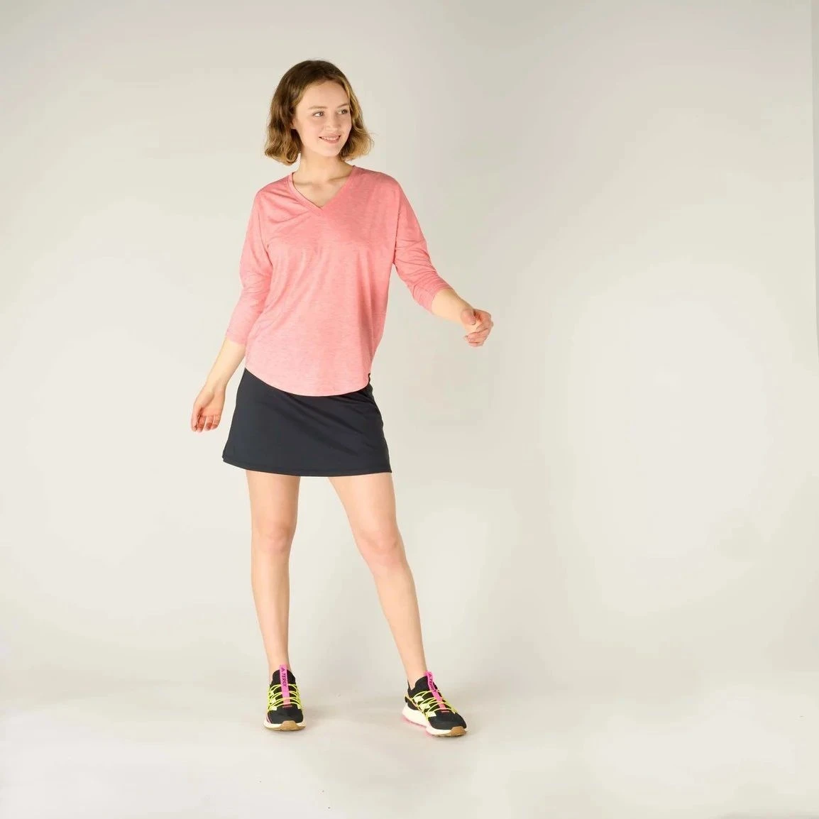 Das Asha-Top mit V-Ausschnitt und ¾-langen Ärmelnvon Sherpa ist das perfekte Top für Reisen, reich an nachhaltiger Textiltechnologie für ganztägigen Tragekomfort und Leistung. Hergestellt aus Repreve®-Polyester, das aus recycelten Plastikflaschen gewonnen wird, ist dieses T-Shirt ein echtes Beispiel für umweltbewusste Kleidung. Dank der drirelease®-Technologie reguliert das Material die Körpertemperatur und leitet überschüssige Feuchtigkeit schnell von der Haut weg, sodass die Trägerin den ganzen Tag über trocken und komfortabel bleibt.